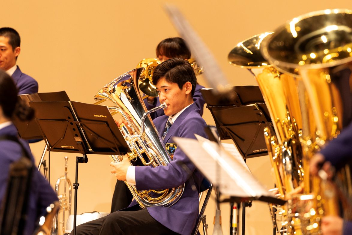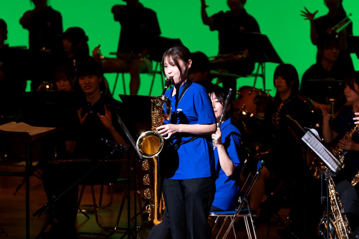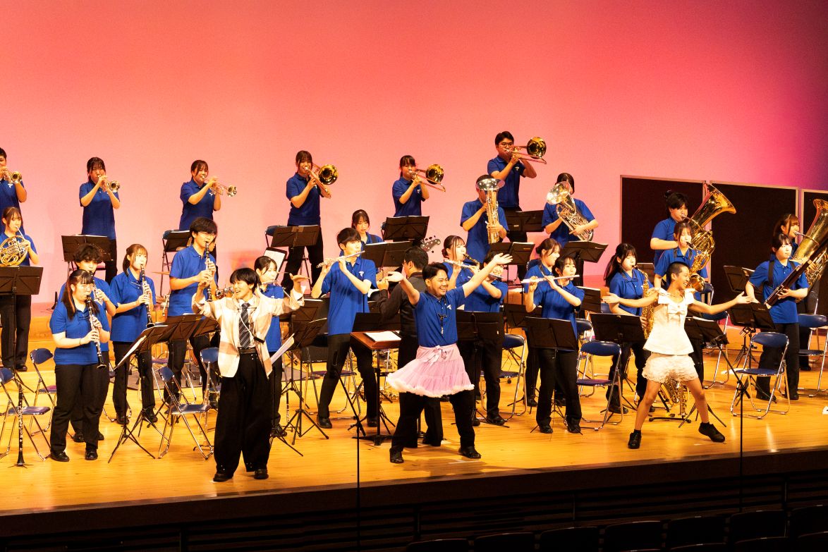 2025年12月21日(日)、帝京大学八王子キャンパスキュリオシティホールにて帝京大学吹奏楽部第52回定期演奏会を実施しました。第1部マーチングステージショー・アンサンブルステージ、第2部シンフォニックステージ、第3部ポップスステージの三部構成で、コンクールで演奏した曲からSNSで大流行したSNSバズりメドレーまで幅広い楽曲を披露しました。今年度主将を務めた鈴木万梨子さん(文学部3年)は「4月に新入部員約20人迎え、吹奏楽部が大きく変化した1年だった。日々練習に取り組んできた集大成をぜひお楽しみください」とあいさつし、部員数が増えたことで数年ぶりにカラーガードが復活するなど、例年以上に見ごたえのある演奏会になりました。会場には硬式野球部や駅伝競走部の学生をはじめ多くの方が来場し、演奏会の運営には吹奏楽部OBOGが協力するなど、多くの方に支えられ盛況のうちに終演しました。会場に足を運んでくださった皆さま、祝電や祝花を送ってくださった皆さま、ありがとうございました。今後も吹奏楽部への温かい応援、ご支援をよろしくお願いします。