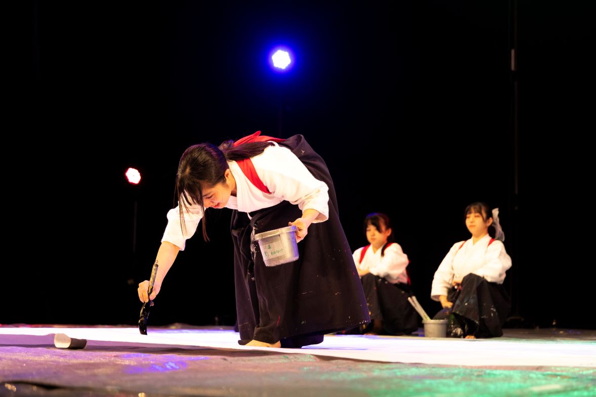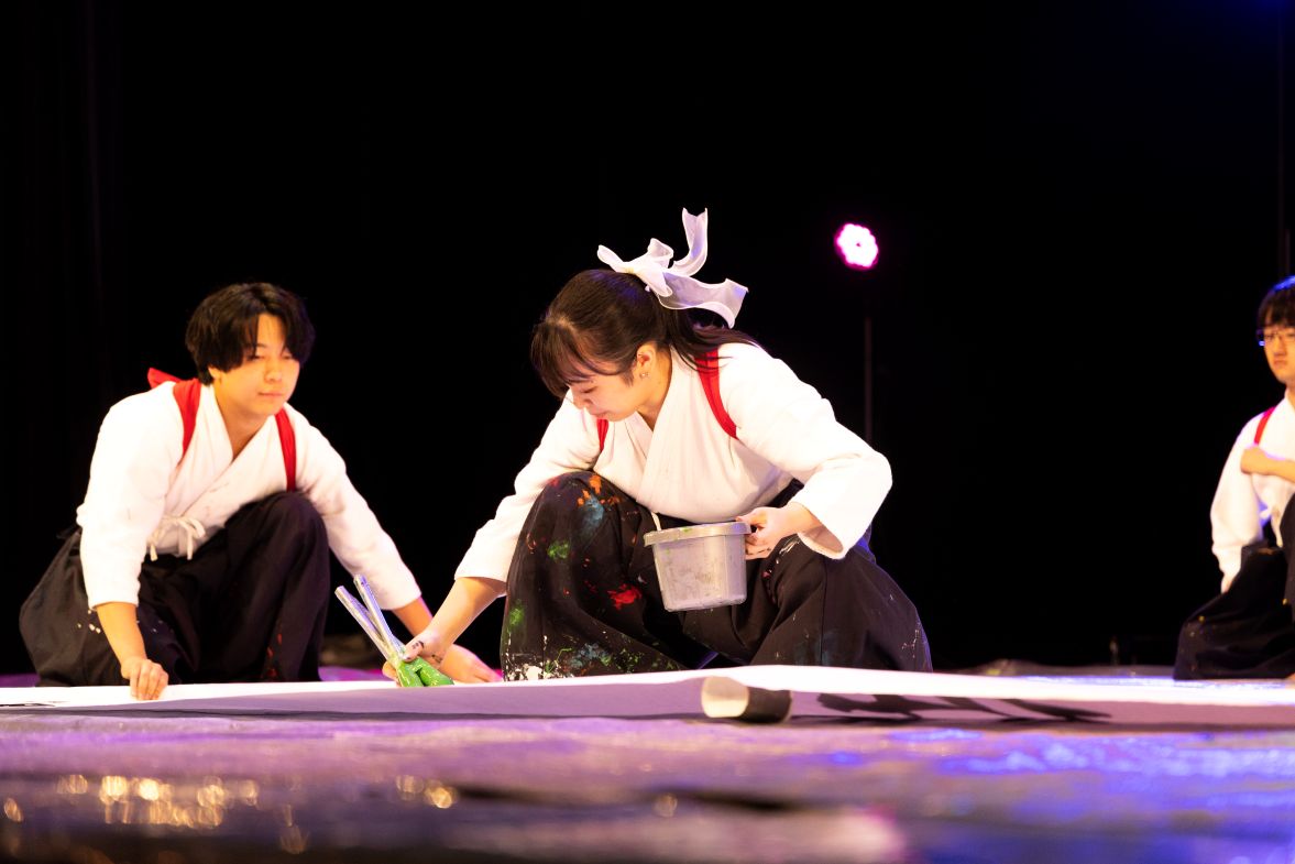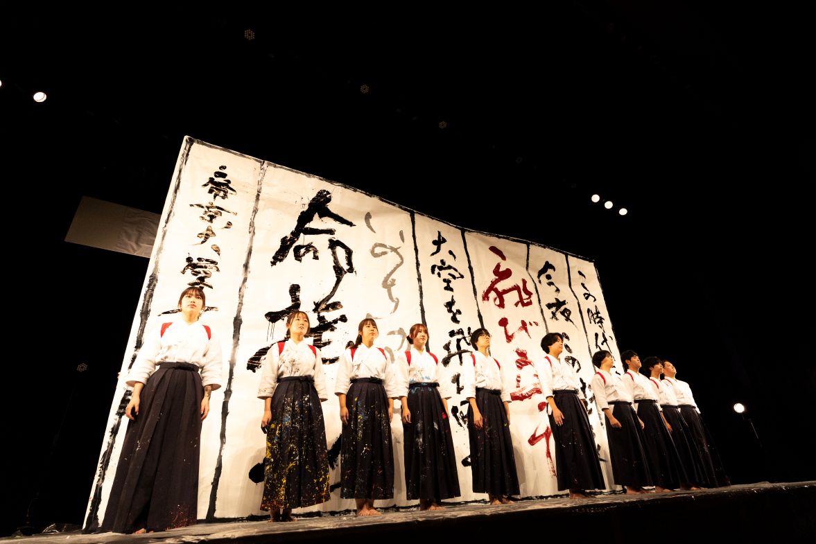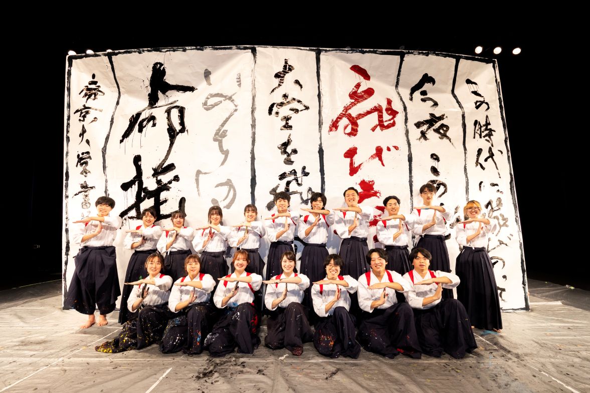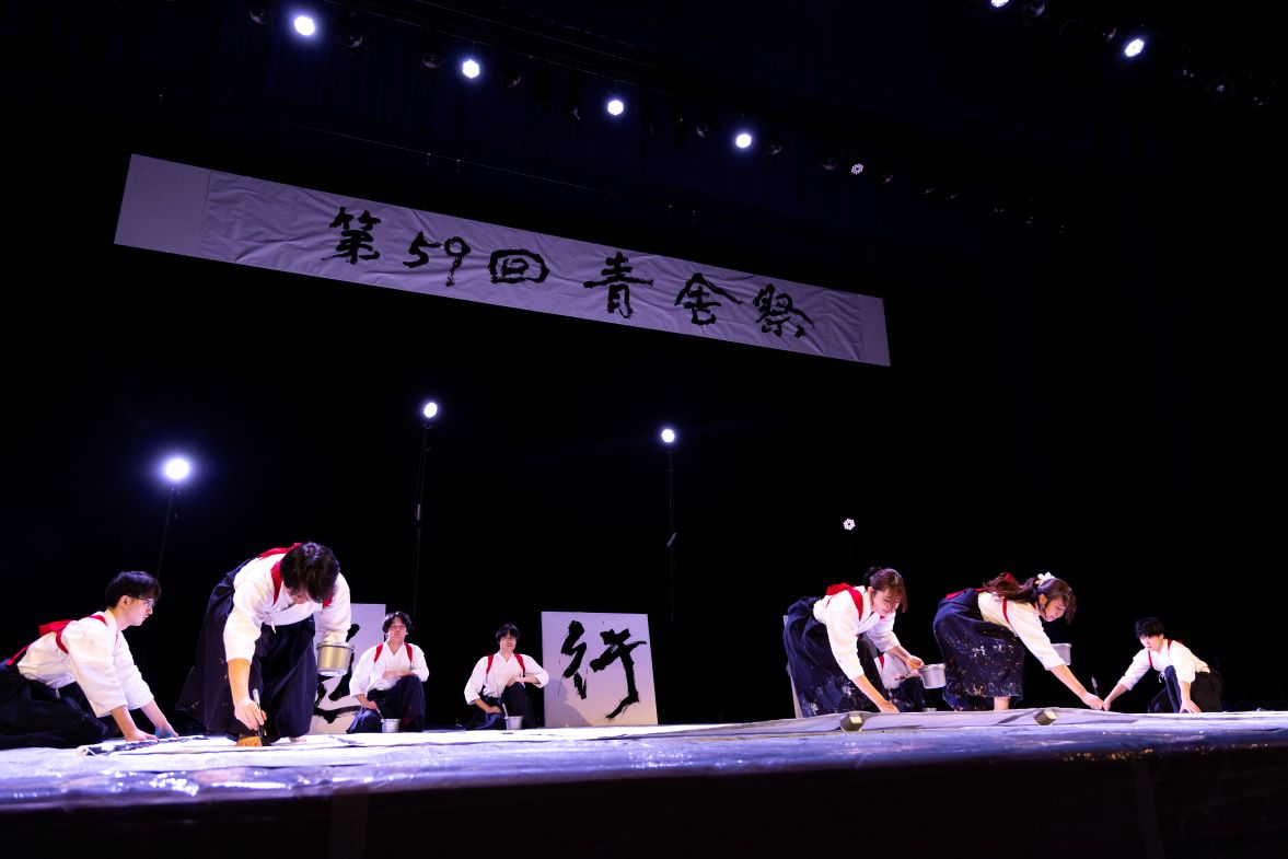 2025年10月26日(日)、帝京大学八王子キャンパスの大学祭「青舎祭」にて帝京大学書道部が書道パフォーマンスを披露しました。最初のステージでは2枚のパネルに今年の青舎祭のスローガン「一心創青」をダイナミックに力強く書き上げました。続いて「道」「飛行艇」にのせてそれぞれの曲を表現した作品を披露し、会場からは感嘆の声が上がりました。会場となったキュリオシティホールには多くの方が来場し、多くの方にパフォーマンスを見ていただくことができました。