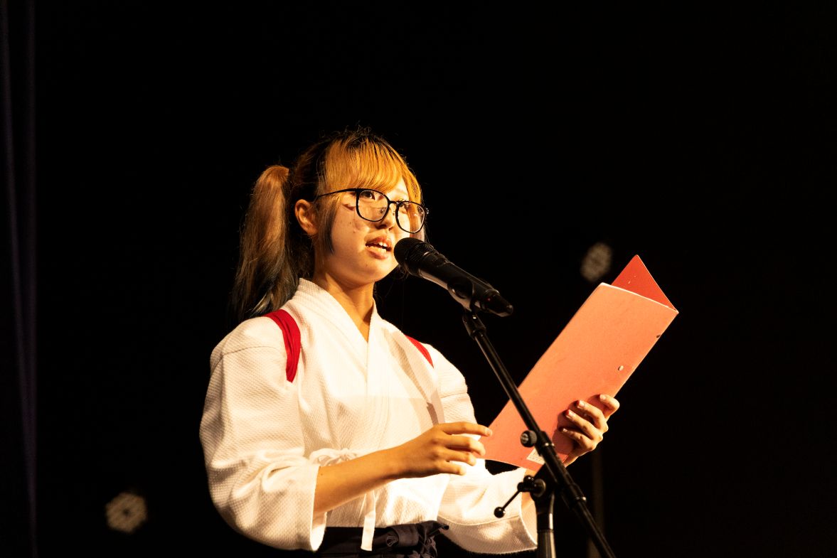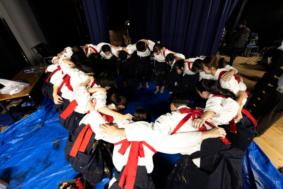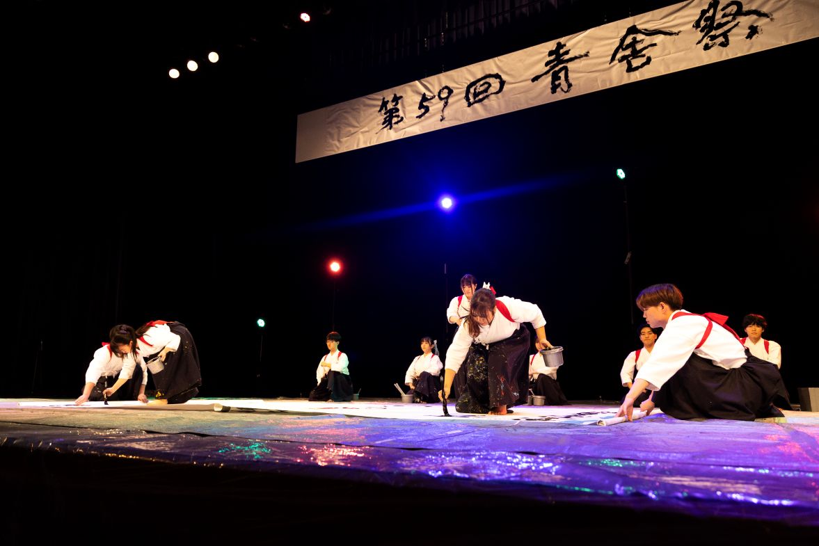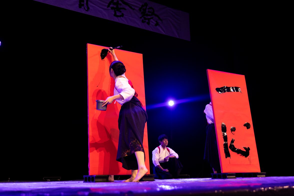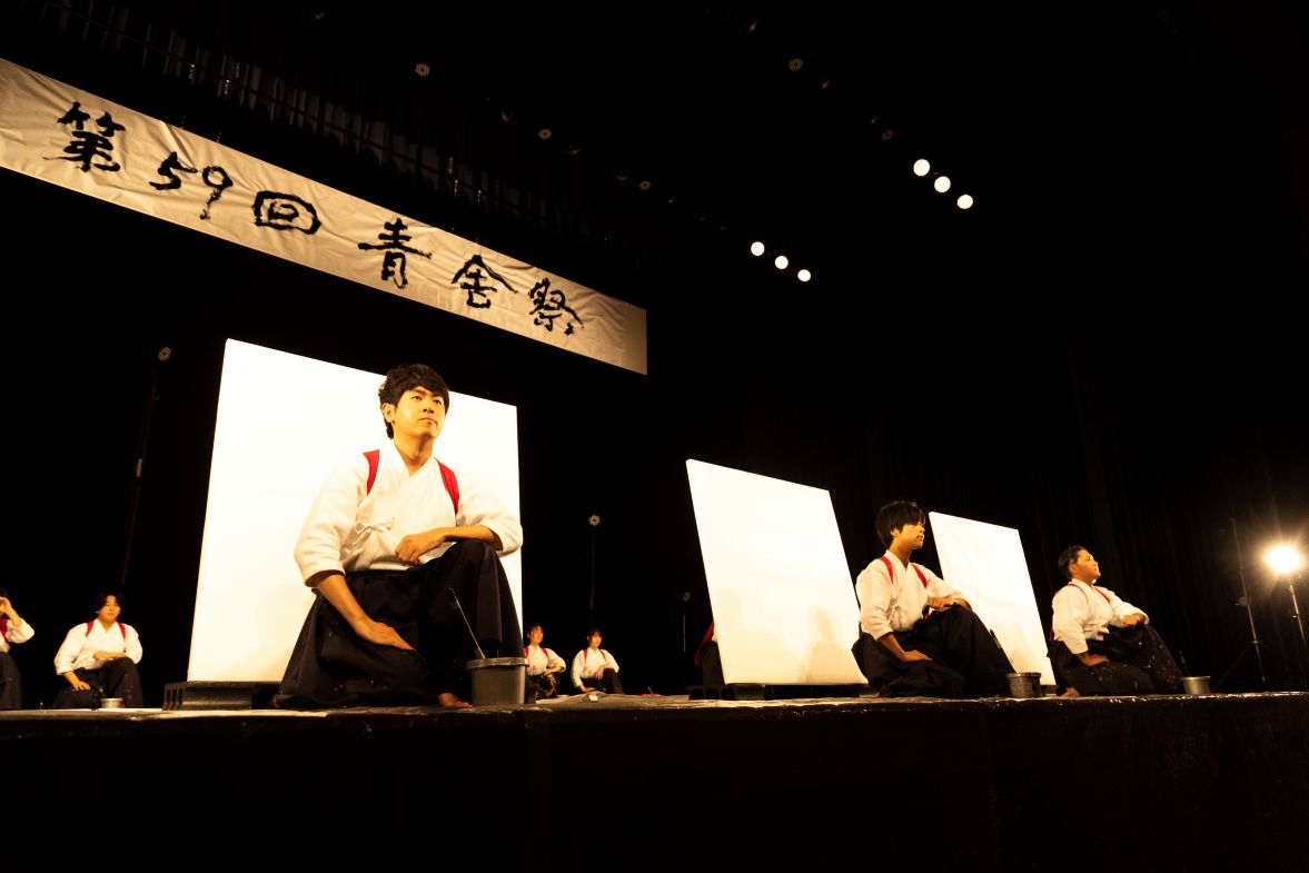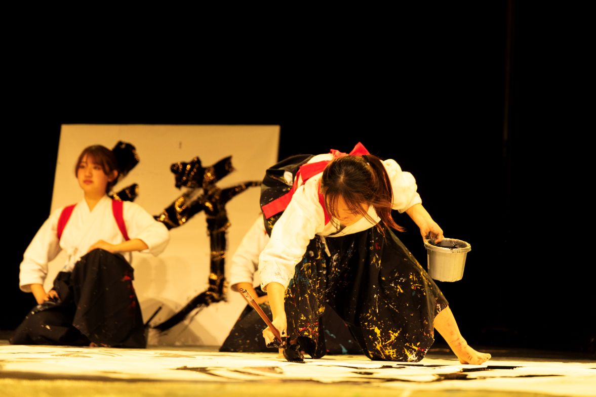 2025年10月26日(日)、帝京大学八王子キャンパスの大学祭「青舎祭」にて帝京大学書道部が書道パフォーマンスを披露しました。最初のステージでは2枚のパネルに今年の青舎祭のスローガン「一心創青」をダイナミックに力強く書き上げました。続いて「道」「飛行艇」にのせてそれぞれの曲を表現した作品を披露し、会場からは感嘆の声が上がりました。会場となったキュリオシティホールには多くの方が来場し、多くの方にパフォーマンスを見ていただくことができました。
