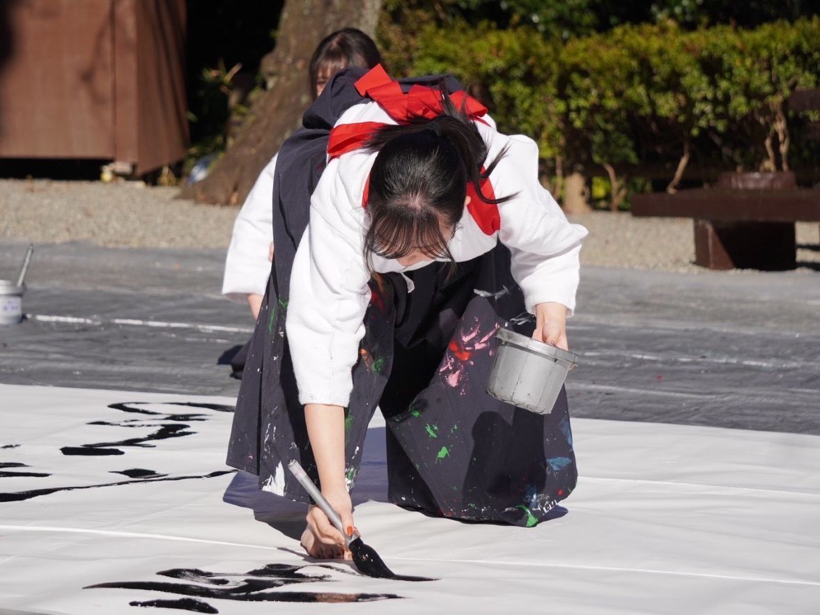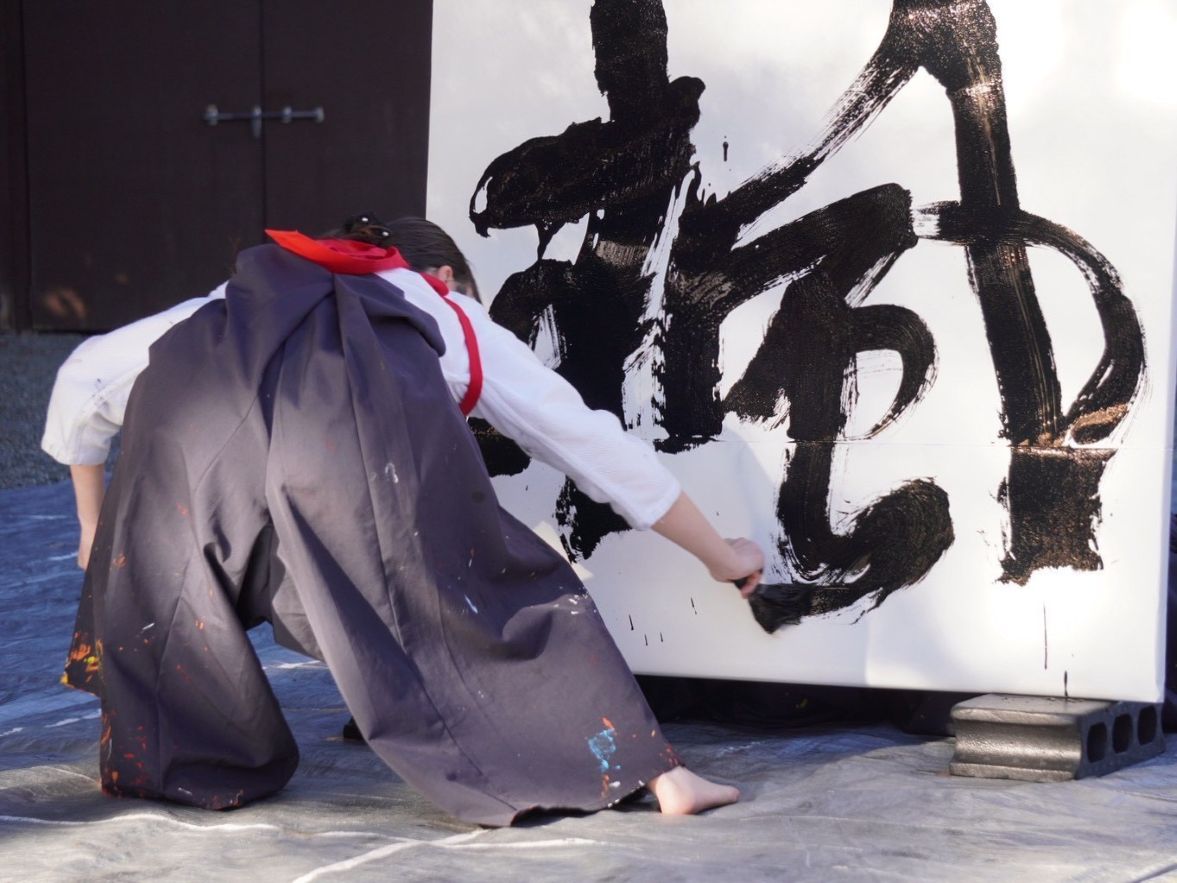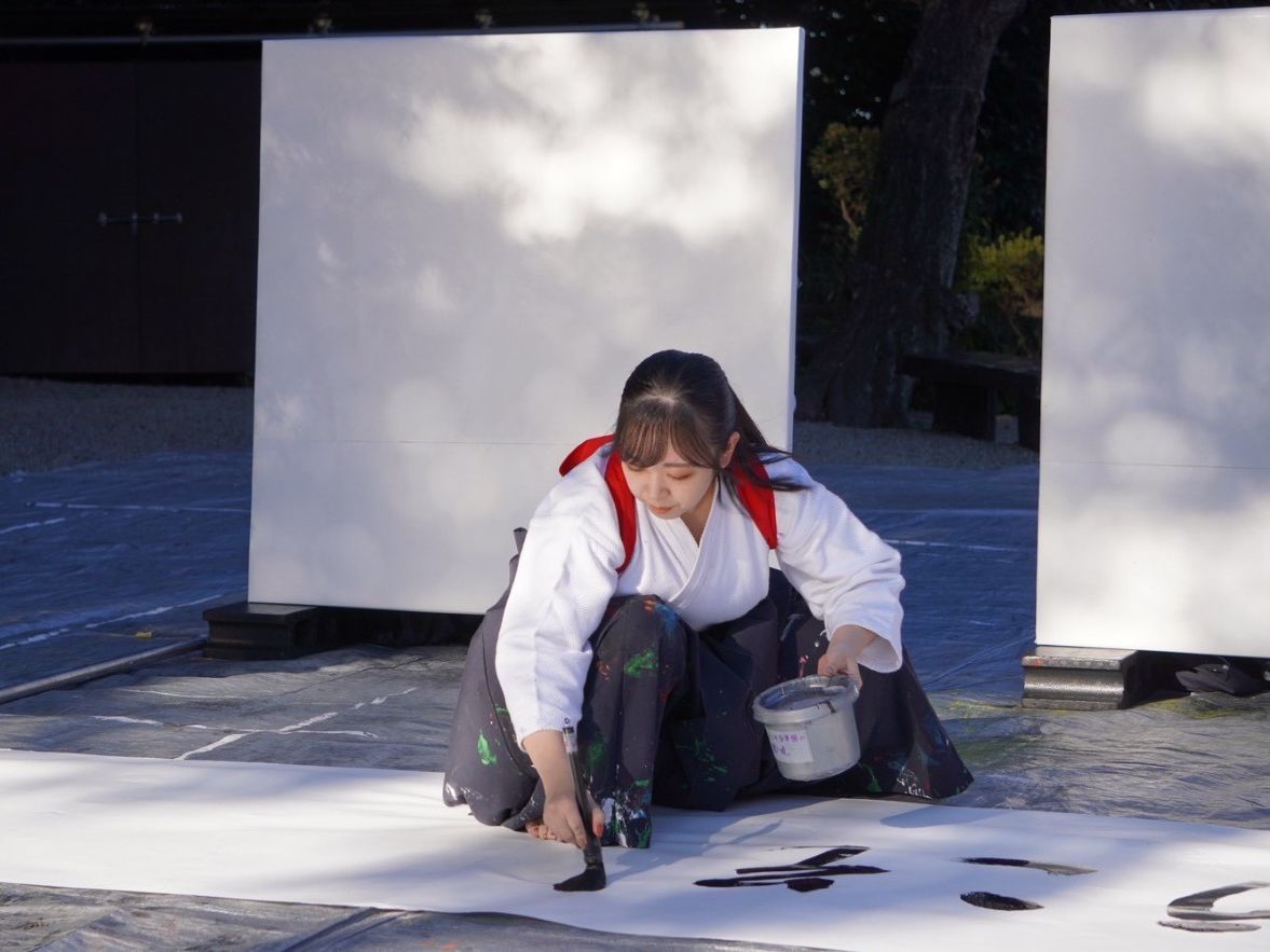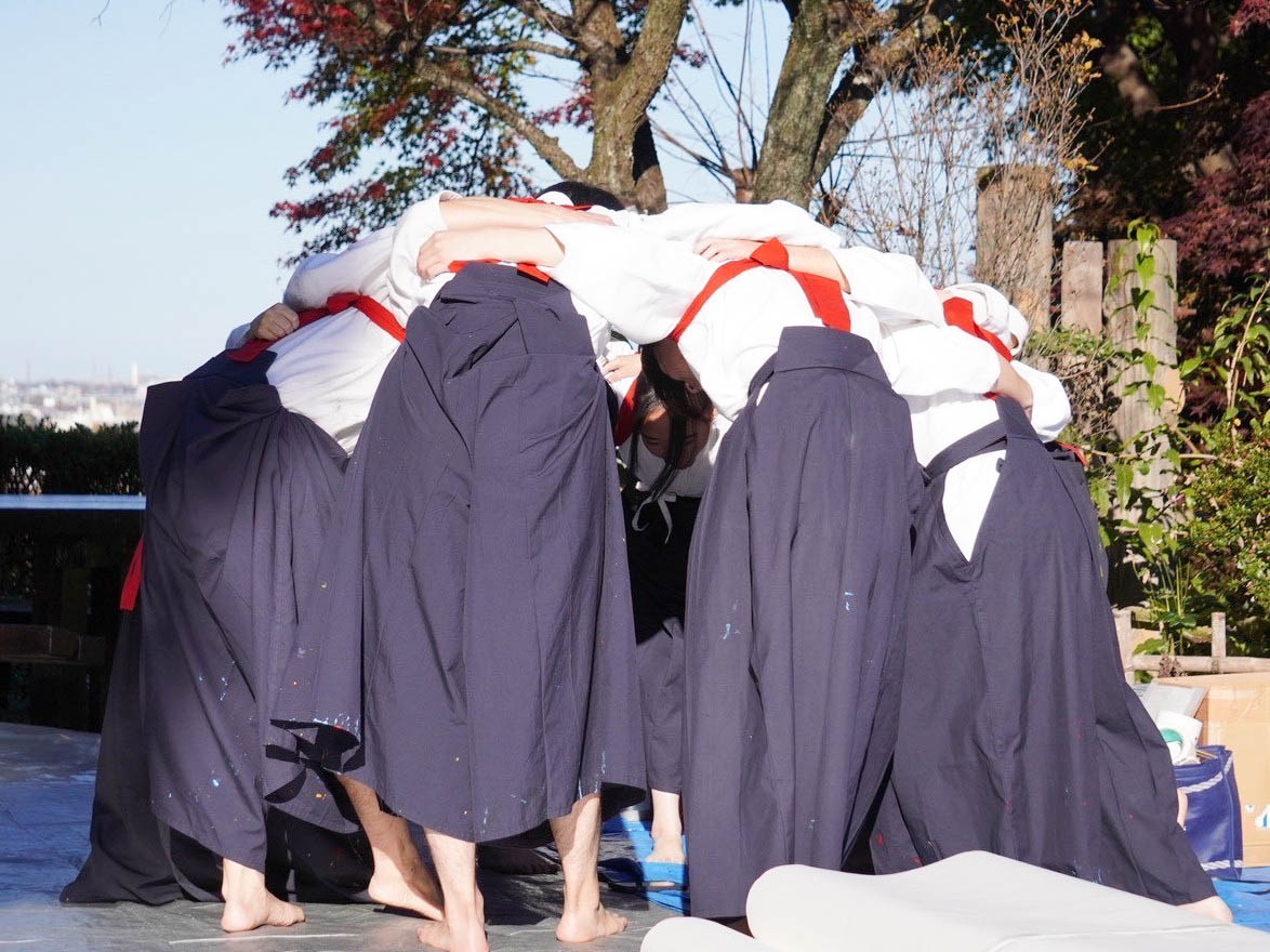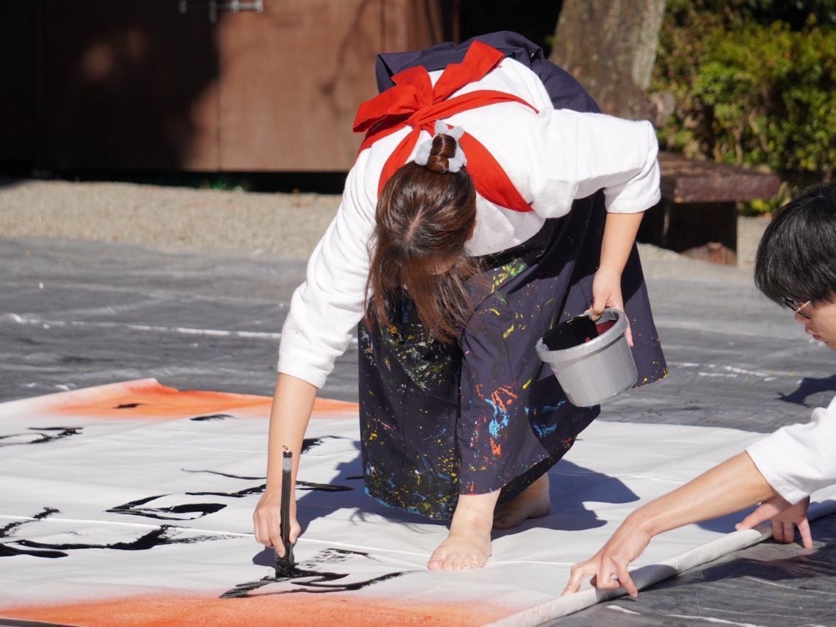 当日は赤や黄色に色づいた木々に囲まれた中、音楽に合わせて大きな紙に文字を書くパフォーマンスに加え、パネルや横断幕などを用いた新しい形式の演目にも挑戦し、全3演目を披露しました。音楽は「和」を感じられるものを選び、演目の題材には漢詩に用いられる語句や松尾芭蕉の俳句を取り入れることで、秋景色の美しい庭園と書が調和する、風情あるパフォーマンスとなるよう工夫しました。多くのお客様にご来場いただき、温かな拍手の中で締めくくることができました。