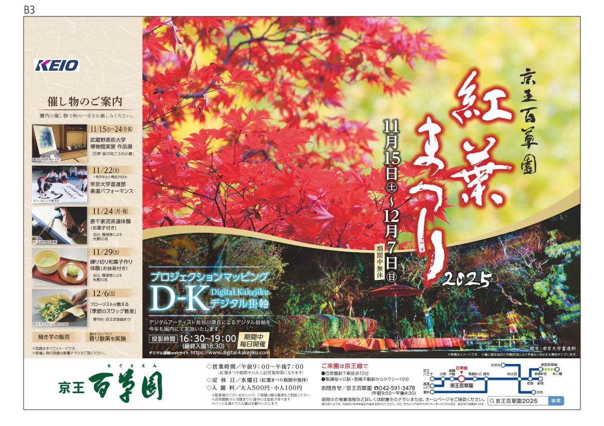 また、紅葉まつりの告知では、書道部が題字を揮毫し、ポスター・チラシ・車内中吊りポスター・デジタルサイネージとして京王線・井の頭線の各所で掲出されました。